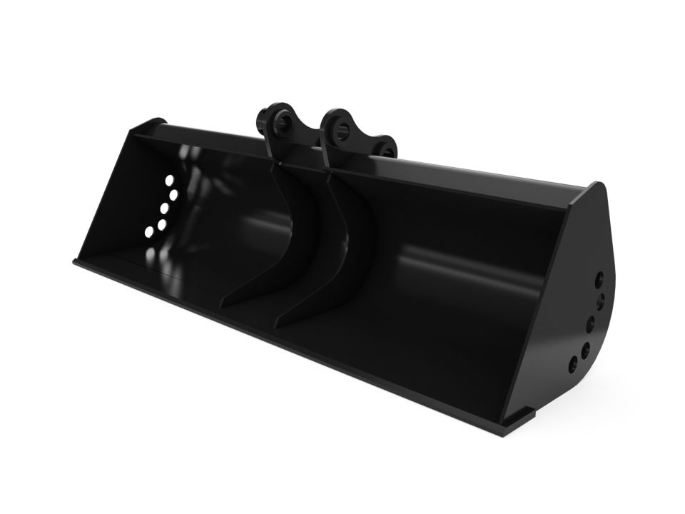 Versatile bucket for applications such as cleaning wide trenches, loading materials, grading, dressing slopes and more.