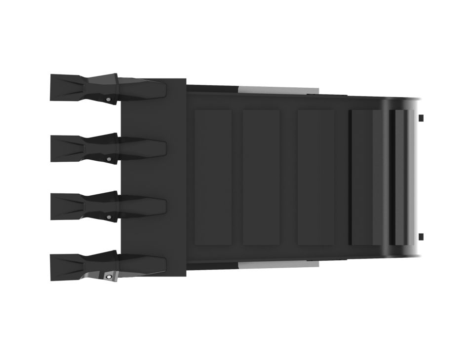 Enhanced bucket shape allows material to flow more easily. Tapered bucket sidewalls allow for easy dumping of sticky material.