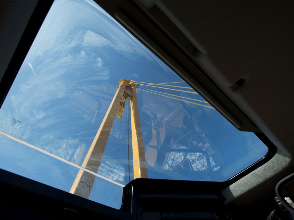 • Enlarged roof top window with retractable shade, additional mirrors, and angled door improves visibility to the trench, boom and blocks.