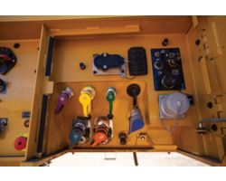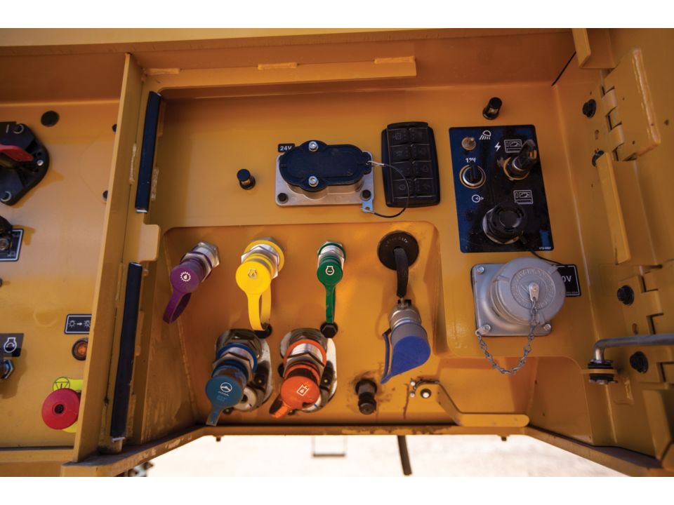 • Service station that provides easy access to functions such as coolant and oil as well as level indicators; Cat battery charging connector; and indicator lights for full fuel tanks.