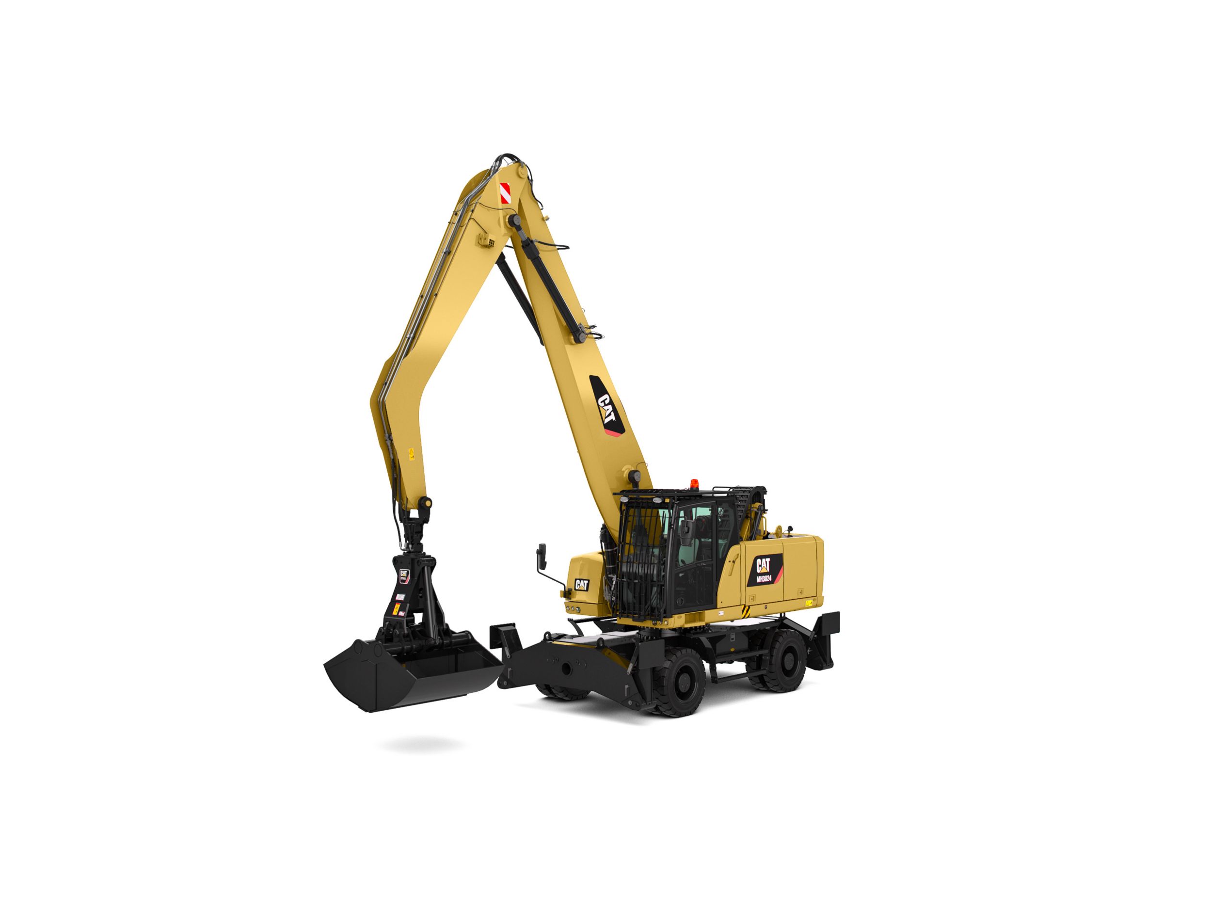 Cat material handlers. They are made for industrial, recycling, and millyard applications requiring large lifting capacities and working envelopes. Their low operating costs and high production help ensure your success.